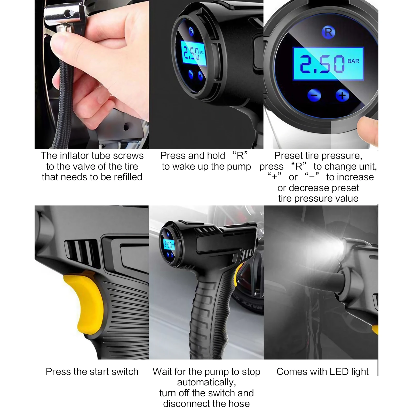 The integrated LED light provides practical illumination during nighttime and low-visibility roadside use — lighting the tyre valve area for accurate connection, the display for clear pressure reading, and the surrounding area for general safety during a roadside stop. In an emergency situation at night — on a motorway, in a car park, on a country road — the LED light is the difference between a manageable situation and a genuinely dangerous one.